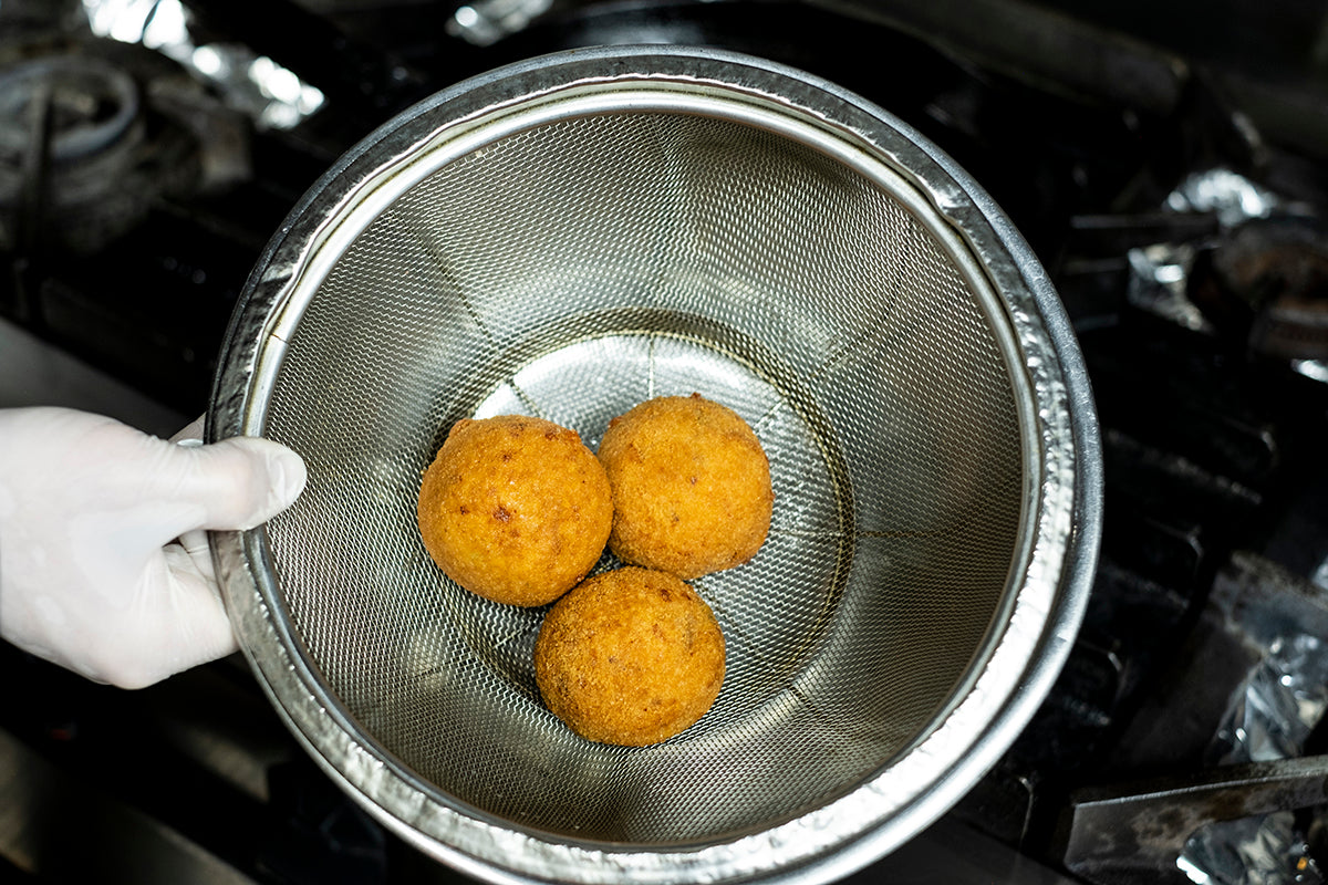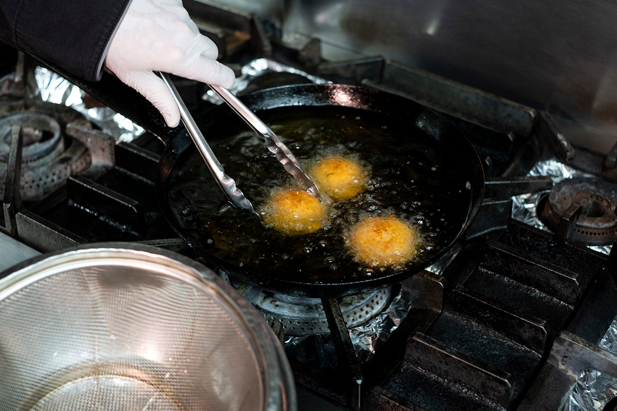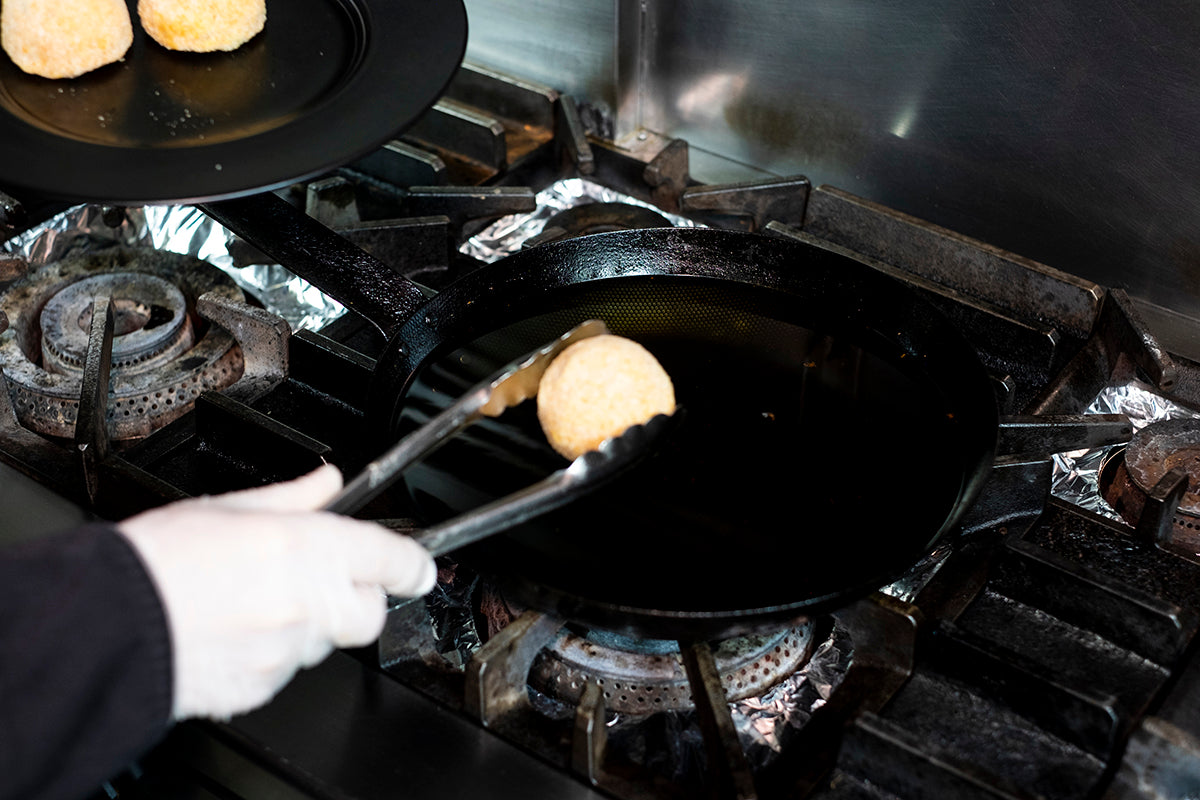 東温市の有機ヒノヒカリをベースに、ファットリア・ビオ北海道のカチョカバロを贅沢に使ったオリジナルライスコロッケ。